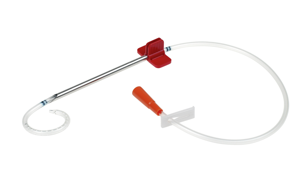 - Catheter made of polyurethane with curled pigtail (J) tip and depth markings
